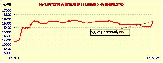 23日現(xiàn)貨價(jià)格繼續(xù)追漲,漲幅百元以上,升至1.6萬元以上。標(biāo)準(zhǔn)級328B級價(jià)格指數(shù)16023元,漲95元,各地區(qū)均漲百元以上,安徽、江蘇等地區(qū)漲200元左右。截止23日現(xiàn)貨價(jià)格較上月末漲570元,是2017年來單月漲幅最快的一個(gè)月,其中5月17-22日5個(gè)交易日漲477元,占全月漲幅的83.7%。受鄭棉和現(xiàn)貨追漲影響,近兩日儲備棉全部成交,價(jià)格大幅上揚(yáng),成交均價(jià)超過1.5萬元,折328級達(dá)16300元。魏橋紡織股份于5月2日入市以來,累計(jì)成交5642噸,成交均價(jià)15253元/噸,其中2-16日均價(jià)14732元,18-22日均價(jià)15253元,較前期上漲千元以上。