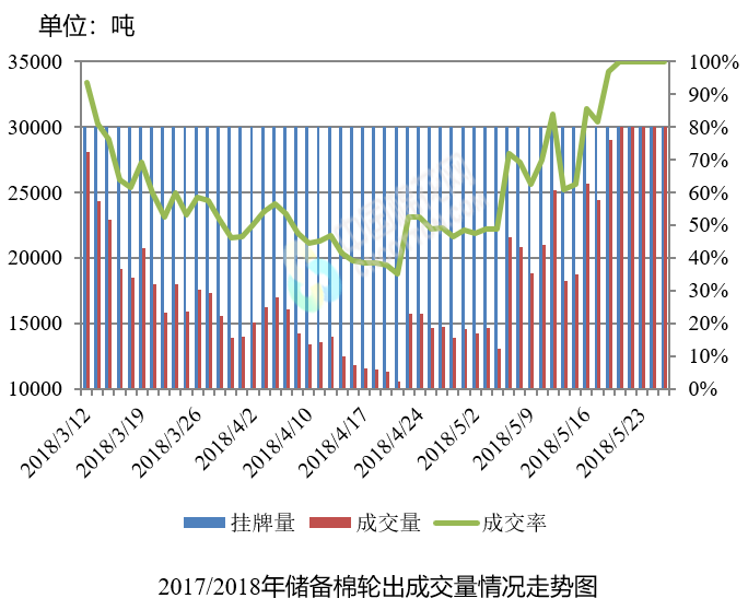 5月25日儲備棉輪出銷售資源30007.709噸,實(shí)際成交30007.709噸,成交率100.00%。平均成交價格15342元/噸(較前一日上漲115元/噸);折3128價格16562元/噸(較前一日上漲181元/噸)。