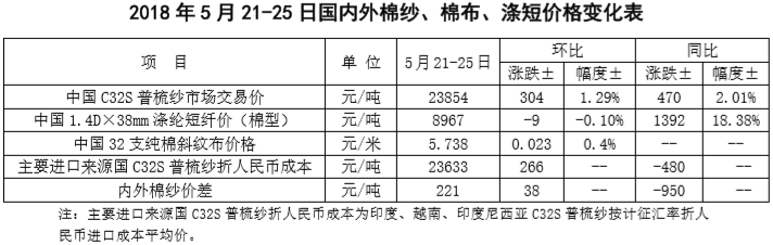附件2:2018年5月21-25日國(guó)內(nèi)外棉紗價(jià)格變化表