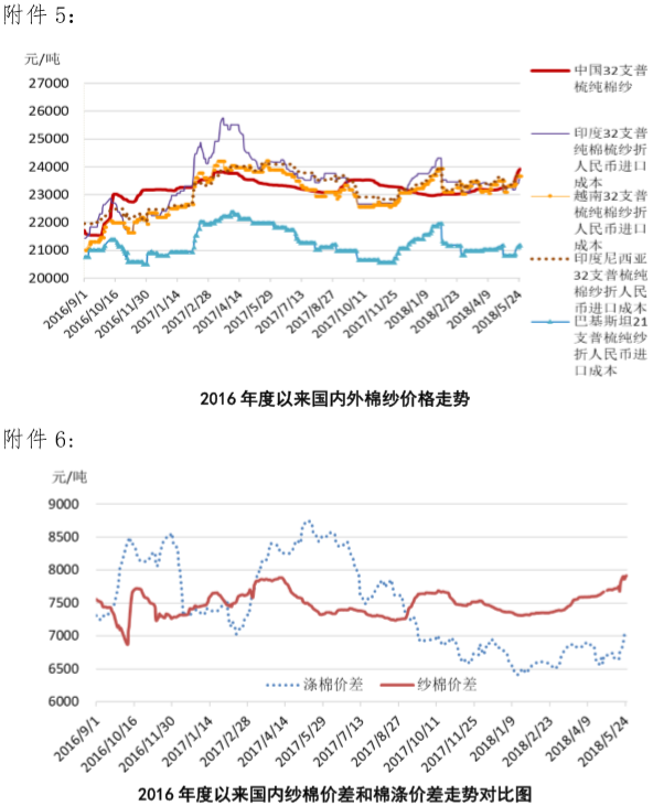 附件5:2016年度以來(lái)國(guó)內(nèi)外棉紗價(jià)格走勢(shì)圖