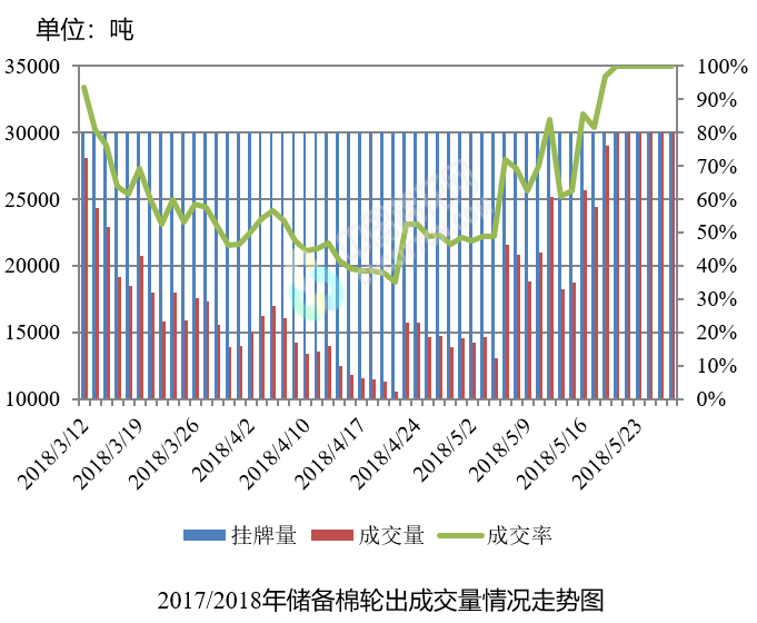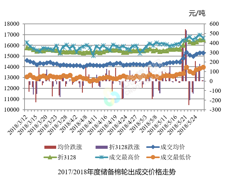 5月28日儲(chǔ)備棉輪出銷售資源30007.779噸,實(shí)際成交30007.779噸,成交率100.00%。平均成交價(jià)格15349元/噸(較前一日上漲7元/噸);折3128價(jià)格16571元/噸(較前一日上漲9元/噸)。