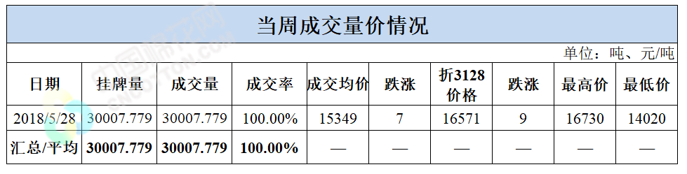累計(jì)情況:截至5月28日,累計(jì)計(jì)劃出庫162萬噸,累計(jì)出庫成交100.3萬噸,成交率為62%;成交最高價(jià)17020元/噸,最低價(jià)13900元/噸。