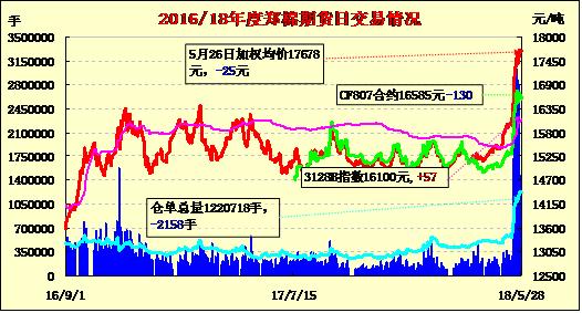 5月28日受鄭棉止?jié)q回調(diào)影響,棉紗期貨跌多漲少。隔夜棉紗期貨反彈后急速回落,今日低位震蕩整理,互有漲跌。當(dāng)日各合約加權(quán)平均成交價(jià)26226元/噸,與前一交易日基本持平。成交13.83萬(wàn)手,減5.96萬(wàn)手,總持倉(cāng)1.52萬(wàn)手,增554手。其中主力CY810合約26225元/噸,跌0元,成交13.71萬(wàn)手,減5.89萬(wàn)手,增倉(cāng)424手,持倉(cāng)1.47萬(wàn)手。
