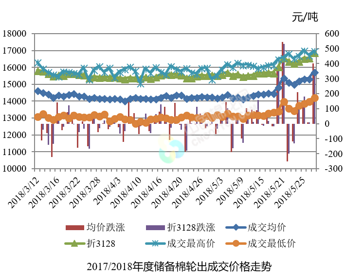 5月29日儲(chǔ)備棉輪出銷(xiāo)售資源30005.869噸,實(shí)際成交30005.869噸,成交率100.00%。平均成交價(jià)格15752元/噸(較前一日上漲403元/噸);折3128價(jià)格16895元/噸(較前一日上漲324元/噸)。