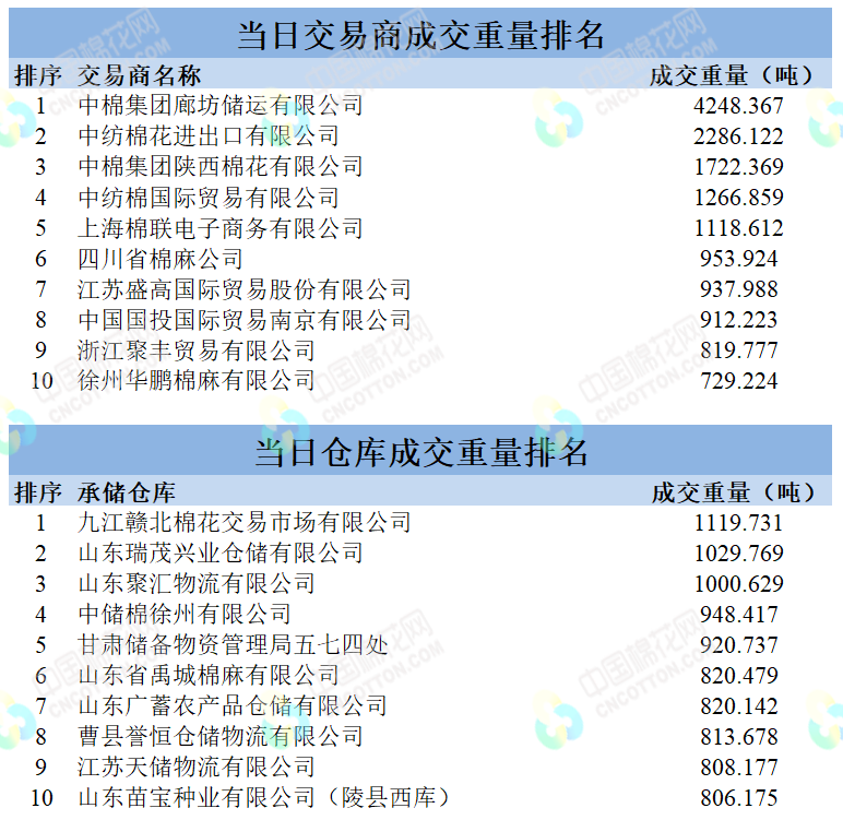 地產(chǎn)棉成交7775.393噸,成交率100%,成交均價(jià)15141元/噸,平均加價(jià)1016元/噸,最高成交價(jià)16560元/噸,最低成交價(jià)14230元/噸;新疆棉成交22230.476噸,成交率100%,成交均價(jià)15966元/噸,平均加價(jià)1820元/噸,最高成交價(jià)16980/噸,最低成交價(jià)15020元/噸。