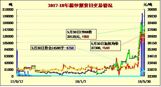 5月30日棉花、棉紗期貨雙雙繼續(xù)大漲,尾盤減倉下滑。隔夜棉紗期貨高開下調(diào),午后回穩(wěn),尾盤在大量平倉打壓下調(diào),終盤收陰。今日主力CY810合約27475元高開,收于26760元/噸,結(jié)算價(jià)27300元/噸,漲545元,減倉4764手,持倉1.41萬手。呈倉單出逃式的向下調(diào)整。