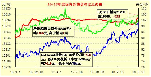 5月30日內(nèi)外棉價(jià)聯(lián)動暴漲,外棉漲速快于內(nèi)棉,內(nèi)外價(jià)差收窄。受隔日鄭棉期貨漲停和紐約期繼續(xù)收漲影響,國內(nèi)現(xiàn)貨棉價(jià)大幅上調(diào),328B指數(shù)漲262元,報(bào)16398元/噸,Cotlook A指數(shù)100.7美分/磅,大漲400點(diǎn)?;瑴?zhǔn)稅折口岸價(jià)16399元,1%稅率折口岸價(jià)15694元/噸,分別較昨日漲466和616元,內(nèi)外棉價(jià)差分別為,滑準(zhǔn)稅折口岸價(jià)與國內(nèi)持平,1%關(guān)稅折口岸價(jià)縮小至466元。從近期新棉國際棉價(jià)走勢情況看,預(yù)期可能將面臨高棉價(jià)時(shí)期,目前國際新年度棉價(jià)民升至102美分/磅。