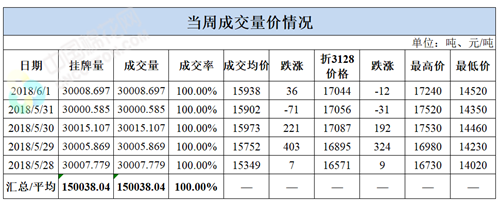 累計情況:截至6月1日,累計計劃出庫174萬噸,累計出庫成交112.3萬噸,成交率為65%;成交最高價17530元/噸,最低價12700元/噸。