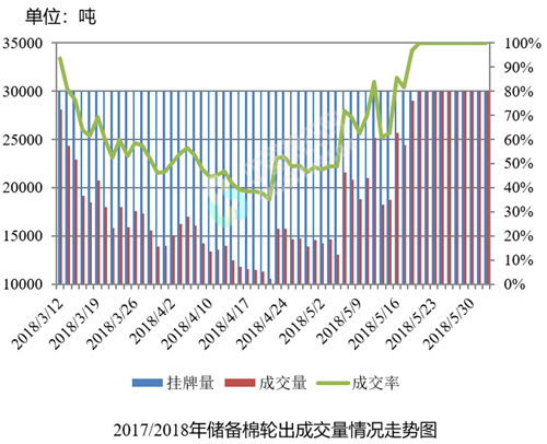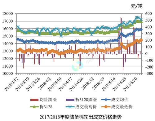 6月1日儲備棉輪出銷售資源30008.6972噸,實際成交30008.6972噸,成交率100.00%。平均成交價格15938元/噸(較前一日上漲36元/噸);折3128價格17044元/噸(較前一日下跌12元/噸)。