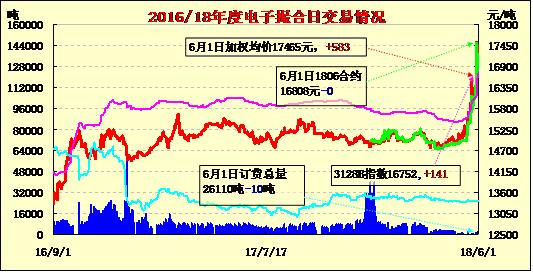 6月1日電子撮合交易成交量減少,市場所有合同遠月有成交,合同均價有所下跌,但因遠期合約價高于近期,加權(quán)平均價高達17465元/噸,比昨日漲583元。MA1810下跌最大,截至收盤下跌371元/噸,其中訂貨量最大的合同為MA1807,累計訂貨量為7520噸。31日紐約期棉市場整體收漲。1807合約結(jié)算價93.15美分,漲66點;1812合約結(jié)算價91.64美分,漲79點;1903合約結(jié)算價90.86美分,漲68點。