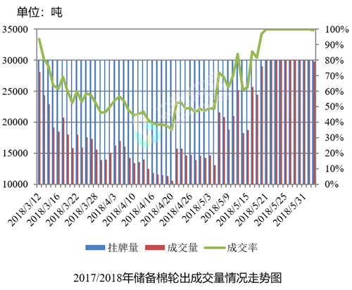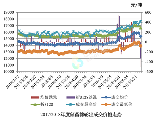 6月4日儲備棉輪出銷售資源30010.4485噸,實(shí)際成交29806.3795噸,成交率99.32%。平均成交價格15430元/噸(較前一日下跌508元/噸);折3128價格16707元/噸(較前一日下跌337元/噸)。