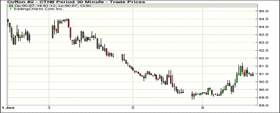6月6日紐約期棉市場全面收漲。1807合約結算價90.95美分,漲111點;1812合約結算價90.55美分,漲157點;1903合約結算價90.33美分,漲152點。其他合約上漲39-147點不等。12月合約穩(wěn)定開盤,開盤后受買盤支撐交易重心小幅走高,后賣盤入場市場承壓下行,至當日低點88.40美分處買盤發(fā)力,交易重心受支撐走高,后在90.50-91.00美分區(qū)間震蕩運行,最終以大幅上漲收盤。周一夜間西德州局部地區(qū)出現(xiàn)陣雨天氣,有利于旱地區(qū)域旱情有所緩解。外圍美元指數(shù)下跌,大豆和玉米期貨下跌,小麥期貨上漲。