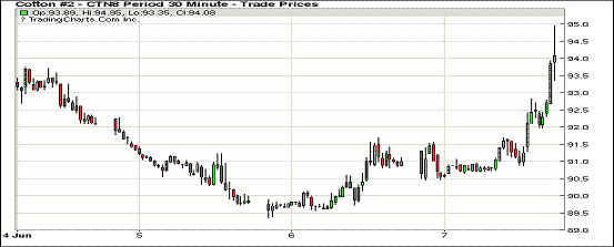 6月7日紐約期棉市場(chǎng)大幅收漲。1807合約結(jié)算價(jià)93.72美分,漲277點(diǎn);1812合約結(jié)算價(jià)92.79美分,漲224點(diǎn);1903合約結(jié)算價(jià)92.58美分,漲225點(diǎn)。其他合約上漲180-239點(diǎn)不等。當(dāng)日12月合約穩(wěn)定開(kāi)盤(pán),開(kāi)盤(pán)后圍繞90.50美分一線震蕩運(yùn)行,后買盤(pán)發(fā)力,市場(chǎng)受支撐上行,加之美棉出口周報(bào)發(fā)布后,高裝運(yùn)量也形成支撐作用,最終以大幅上漲收盤(pán)。據(jù)美國(guó)農(nóng)業(yè)部(USDA),5.24-5.31日一周美國(guó)裝運(yùn)2017/18年度陸地棉130726噸,創(chuàng)本年度新高。規(guī)模最大的多頭基金開(kāi)始7/12月移倉(cāng)。外圍美元指數(shù)下跌,大豆和玉米期貨下跌,小麥期貨上漲。