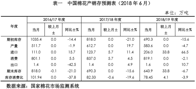 根據(jù)國內(nèi)最新進(jìn)口數(shù)據(jù),本月2017/18年度進(jìn)口量調(diào)增5.7萬噸至123.7萬噸,消費量相應(yīng)調(diào)增5.7萬噸至837萬噸。2018/19年度棉花進(jìn)口量調(diào)增33.8萬噸至206萬噸,消費量未做調(diào)整,期末庫存及庫存消費比相應(yīng)調(diào)增。詳見下表。