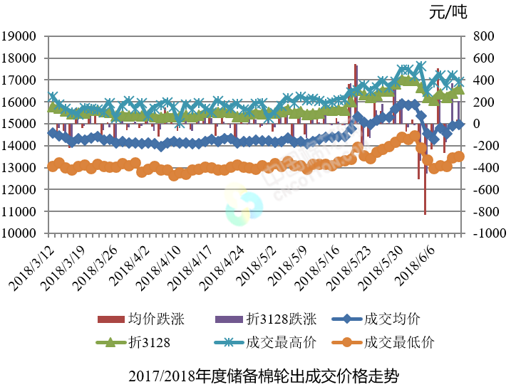 6月12日儲備棉輪出銷售資源30008.2784噸,實(shí)際成交11281.2284噸,成交率37.59%。平均成交價格15017元/噸(較前一日上漲40元/噸);折3128價格16657元/噸(較前一日上漲208元/噸)。