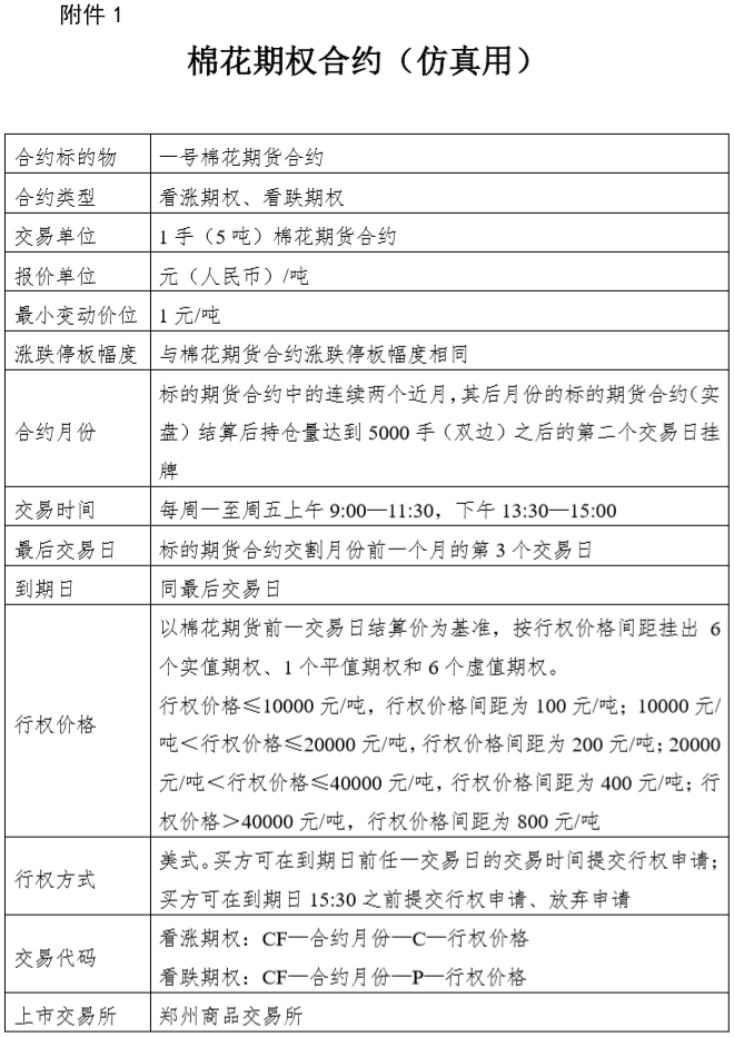 為促進(jìn)期權(quán)新產(chǎn)品開發(fā)和投資者教育工作,鄭州商品交易所將于2018年6月19日起,在仿真環(huán)境開展棉花期權(quán)仿真交易,首日掛牌標(biāo)的合約月份為CF809、CF811、CF901、CF905。
