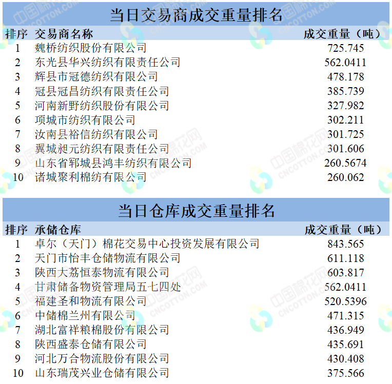 地產(chǎn)棉成交3896.469噸,成交率16.52%,成交均價(jià)14604元/噸,平均加價(jià)153元/噸,最高成交價(jià)16010元/噸,最低成交價(jià)13820元/噸;新疆棉成交5510.654噸,成交率85.80%,成交均價(jià)15589元/噸,平均加價(jià)539元/噸,最高成交價(jià)17530元/噸,最低成交價(jià)14810元/噸。