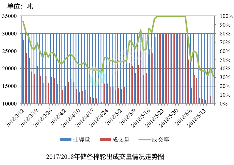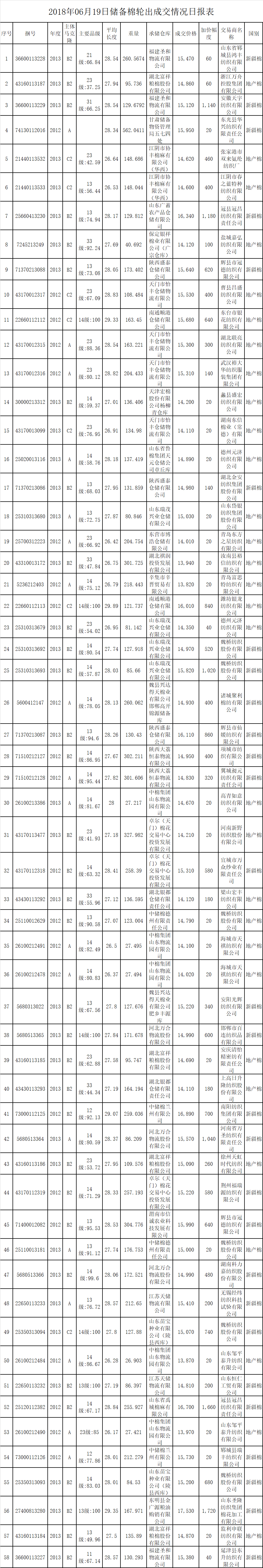 6月19日儲(chǔ)備棉輪出銷售資源30005.3599噸,實(shí)際成交9407.1227噸,成交率31.35%。平均成交價(jià)格15181元/噸(較前一日下跌4元/噸);折3128價(jià)格16392元/噸(較前一日下跌266元/噸)。