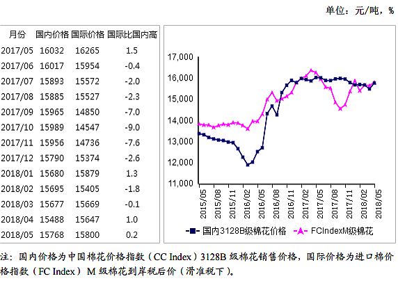 (一)國內(nèi)棉價(jià)環(huán)比上漲。5月份,紡織企業(yè)棉花庫存下降,購棉積極性增強(qiáng),儲(chǔ)備棉成交率持續(xù)上升。據(jù)《中國棉花工業(yè)庫存調(diào)查報(bào)告》采購意向調(diào)查顯示,本月準(zhǔn)備采購原料的企業(yè)占74.7%,環(huán)比提高7.6個(gè)百分點(diǎn)。截至5月31日,儲(chǔ)備棉輪出累計(jì)成交109.3萬噸,成交率64.0%。國內(nèi)皮棉銷售進(jìn)度有所加快,據(jù)國家棉花市場監(jiān)測系統(tǒng)數(shù)據(jù),截至5月25日,全國棉花銷售率為75.5%。5月份,國內(nèi)3128B級(jí)棉花月均價(jià)每噸15768元,環(huán)比漲1.8%,同比跌1.6%。鄭棉期貨主力合約(CF901)月結(jié)算價(jià)每噸18805元,環(huán)比漲22.2%,同比漲20.9%。