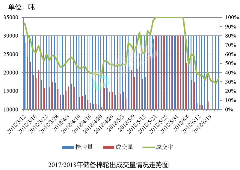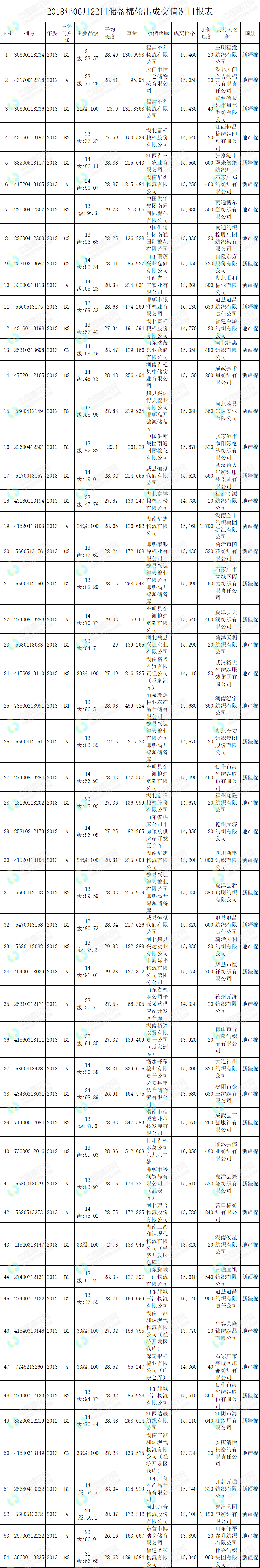 6月22日儲(chǔ)備棉輪出銷售資源30005.4083噸,實(shí)際成交10048.673噸,成交率33.49%。平均成交價(jià)格15215元/噸(較前一日下跌52元/噸);折3128價(jià)格16532元/噸(較前一日下跌201元/噸)。