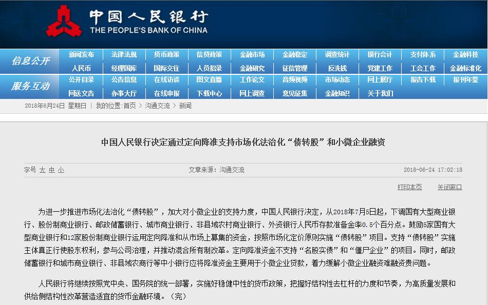 為進一步推進市場化法治化“債轉(zhuǎn)股”,加大對小微企業(yè)的支持力度,中國人民銀行決定,從2018年7月5日起,下調(diào)國有大型商業(yè)銀行、股份制商業(yè)銀行、郵政儲蓄銀行、城市商業(yè)銀行、非縣域農(nóng)村商業(yè)銀行、外資銀行人民幣存款準(zhǔn)備金率0.5個百分點。鼓勵5家國有大型商業(yè)銀行和12家股份制商業(yè)銀行運用定向降準(zhǔn)和從市場上募集的資金,按照市場化定價原則實施“債轉(zhuǎn)股”項目。支持“債轉(zhuǎn)股”實施主體真正行使股東權(quán)利,參與公司治理,并推動混合所有制改革。定向降準(zhǔn)資金不支持“名股實債”和“僵尸企業(yè)”的項目。同時,郵政儲蓄銀行和城市商業(yè)銀行、非縣域農(nóng)商行等中小銀行應(yīng)將降準(zhǔn)資金主要用于小微企業(yè)貸款,著力緩解小微企業(yè)融資難融資貴問題。