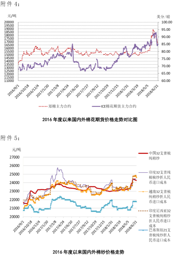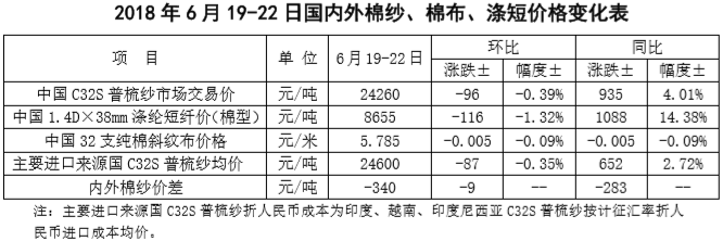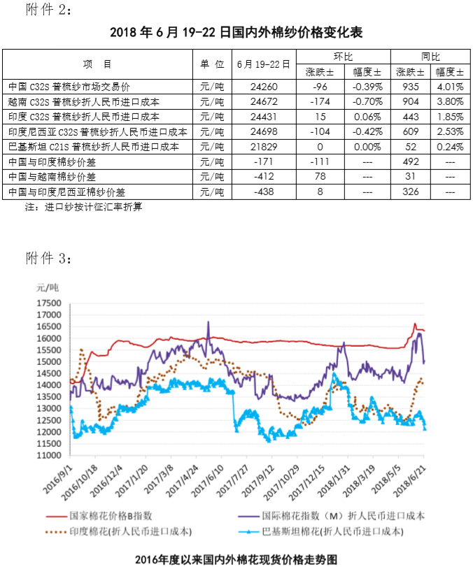 附件2:2018年6月19-22日國內(nèi)外棉紗價(jià)格變化表