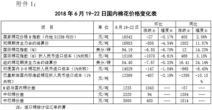附件1:2018年6月19-22日國內(nèi)外棉花價(jià)格變化表