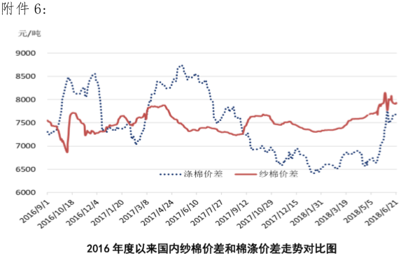 附件6:2016年度以來國內(nèi)紗棉價(jià)差和滌棉價(jià)差走勢對(duì)比圖