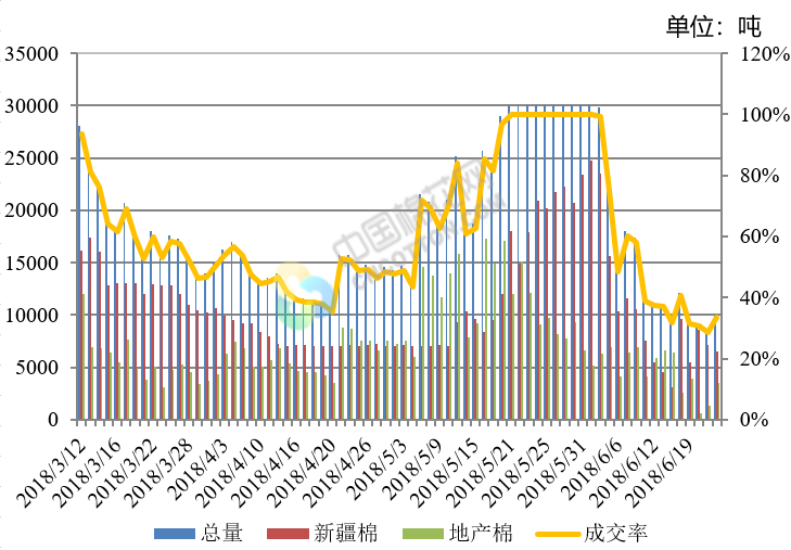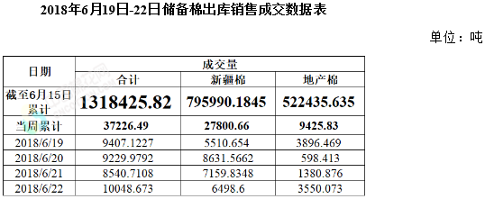 上周(2018年6月19日-22日),2017/2018年度儲(chǔ)備棉輪出第十五周,中國(guó)儲(chǔ)備棉管理有限公司上市交易儲(chǔ)備棉12萬(wàn)噸,其中新疆棉3.4萬(wàn)噸,地產(chǎn)棉8.6萬(wàn)噸;實(shí)際成交3.7萬(wàn)噸,成交率31%,新疆棉成交2.8萬(wàn)噸,成交率82%,地產(chǎn)棉成交0.9萬(wàn)噸,成交率11%。