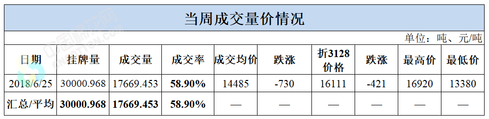 累計情況:截至6月25日,累計計劃出庫219萬噸,累計出庫成交133.6萬噸,成交率為61%;成交最高價17700元/噸,最低價12700元/噸。