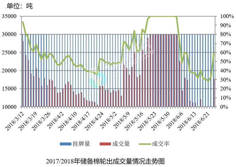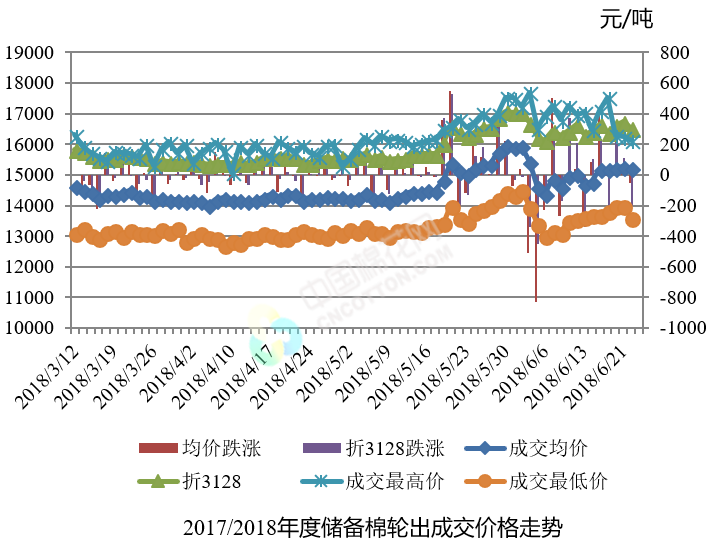 6月25日儲備棉輪出銷售資源30000.9684噸,實際成交17669.4532噸,成交率58.90%。平均成交價格14485元/噸(較前一日下跌730元/噸);折3128價格16111元/噸(較前一日下跌421元/噸)。