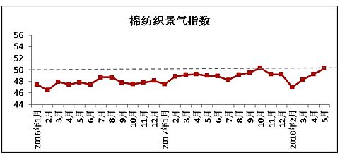 2018年5月中國棉紡織景氣指數(shù)50.21,與4月相比上升0.98,符合預(yù)期。5月棉花期現(xiàn)貨價(jià)格快速上漲,紗布產(chǎn)品價(jià)格跟漲,儲(chǔ)備棉成交率高企。在原有訂單的支撐下,企業(yè)正常生產(chǎn),紗線銷售較火爆,坯布市場(chǎng)相對(duì)清淡。6月為穩(wěn)定國內(nèi)棉花市場(chǎng),有關(guān)部門相繼發(fā)布相關(guān)政策,之后棉花價(jià)格開始回落。但由于市場(chǎng)走淡,企業(yè)接單有所下降,產(chǎn)品庫存開始增加,預(yù)計(jì)6月棉紡織景氣指數(shù)穩(wěn)中略降。