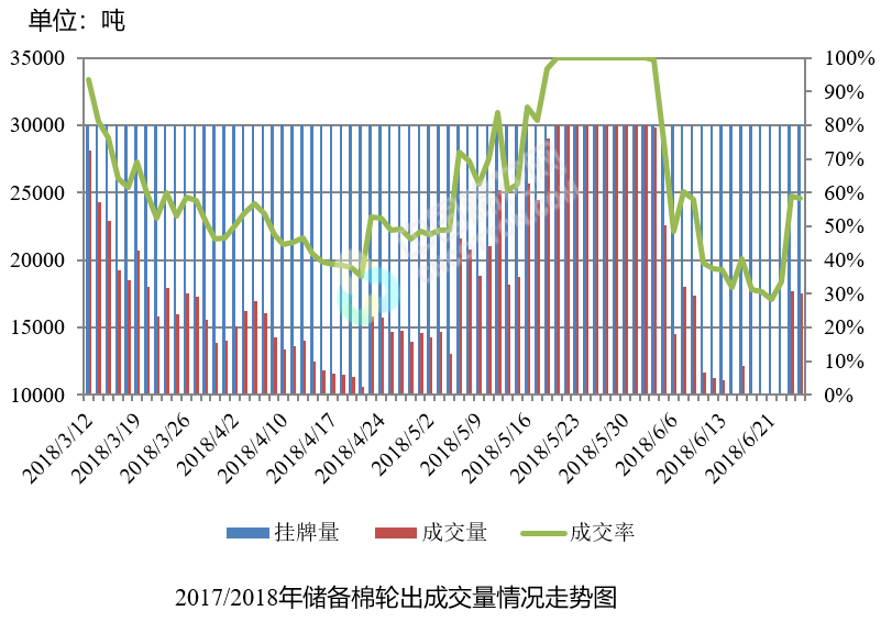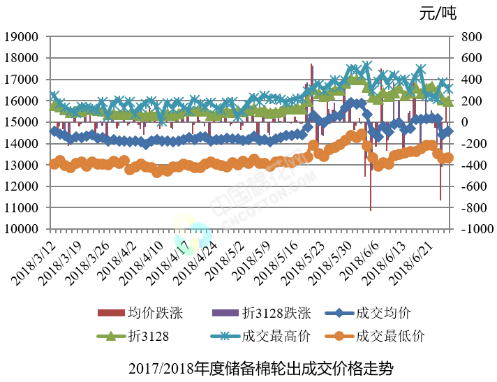 6月26日儲(chǔ)備棉輪出銷售資源30004.3345噸,實(shí)際成交17495.8667噸,成交率58.31%。平均成交價(jià)格14643元/噸(較前一日上漲158元/噸);折3128價(jià)格16044元/噸(較前一日下跌67元/噸)。