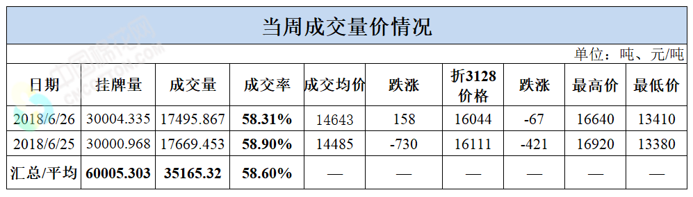 累計(jì)情況:截至6月26日,累計(jì)計(jì)劃出庫222萬噸,累計(jì)出庫成交135.4萬噸,成交率為61%;成交最高價(jià)17700元/噸,最低價(jià)12700元/噸。