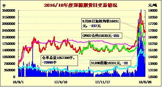 6月26日隔夜鄭棉橫向震蕩,今日早盤在平倉盤壓制下回落,隨后在回補盤支撐下反彈,此后窄幅震蕩,日線形成1/2下影線的陰線。日內成交量萎縮,持倉量減少?;久媲闆r:2018年5月中國棉紡織景氣指數(shù)50.21,與4月相比上升0.98,符合預期。5月,棉花期現(xiàn)貨價格快速上漲,紗布產(chǎn)品價格跟漲,儲備棉成交率高企。在原有訂單的支撐下,企業(yè)正常生產(chǎn),紗線銷售較為火爆,坯布市場相對清淡。6月,為穩(wěn)定國內棉花市場,有關部門相繼發(fā)布相關政策,之后棉花價格開始回落。但由于市場走淡,企業(yè)接單有所下降,產(chǎn)品庫存開始增加,預計6月棉紡織景氣指數(shù)穩(wěn)中略降。