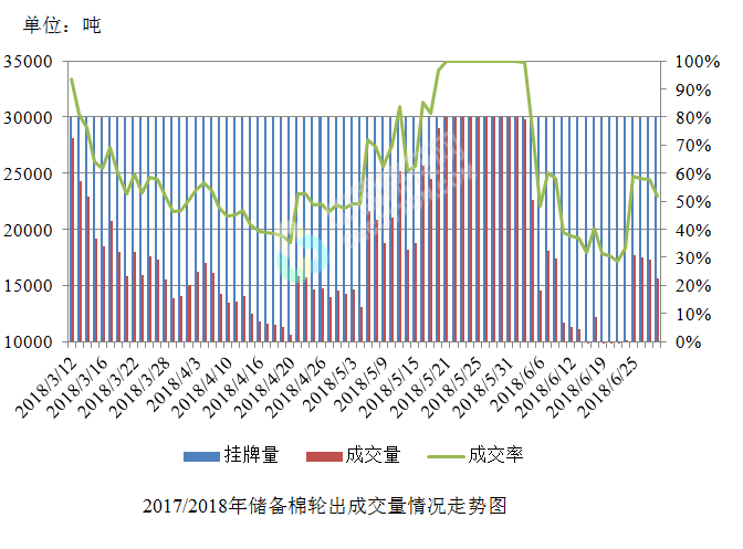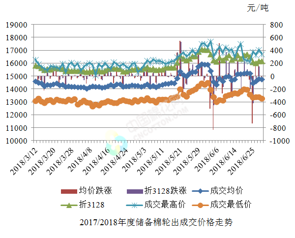 6月28日儲備棉輪出銷售資源30008.2938噸,實(shí)際成交15588.425噸,成交率51.95%。平均成交價(jià)格14774元/噸(較前一日下跌58元/噸);折3128價(jià)格16201元/噸(較前一日上漲8元/噸)。