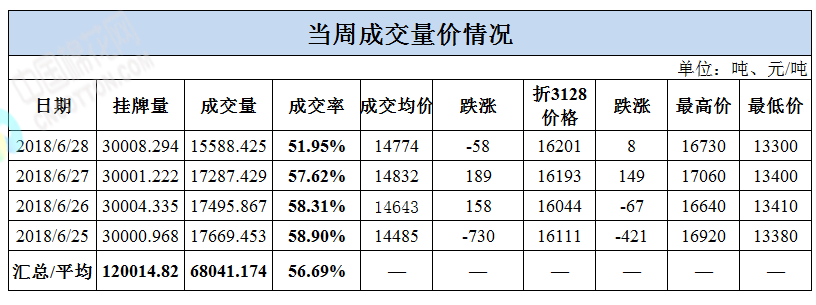 累計(jì)情況:截至6月28日,累計(jì)計(jì)劃出庫228萬噸,累計(jì)出庫成交138.6萬噸,成交率為61%;成交最高價(jià)17700元/噸,最低價(jià)12700元/噸。