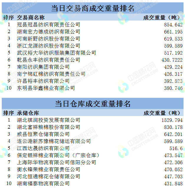 地產(chǎn)棉成交6752.563噸,成交率32.56%,成交均價(jià)14073元/噸,平均加價(jià)252元/噸,最高成交價(jià)15620元/噸,最低成交價(jià)13300元/噸;新疆棉成交8835.862噸,成交率95.30%,成交均價(jià)15310元/噸,平均加價(jià)981元/噸,最高成交價(jià)16730元/噸,最低成交價(jià)14400元/噸。