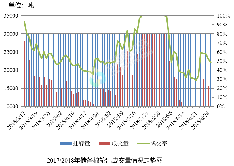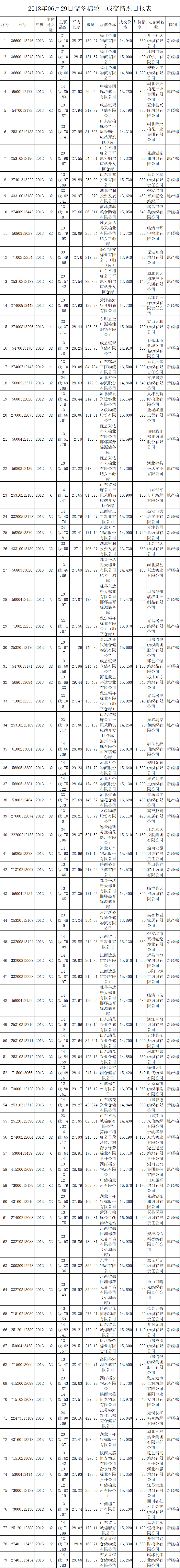 6月29日儲備棉輪出銷售資源30001.2288噸,實際成交14601.1306噸,成交率48.67%。平均成交價格14881元/噸(較前一日上漲107元/噸);折3128價格16261元/噸(較前一日上漲60元/噸)。