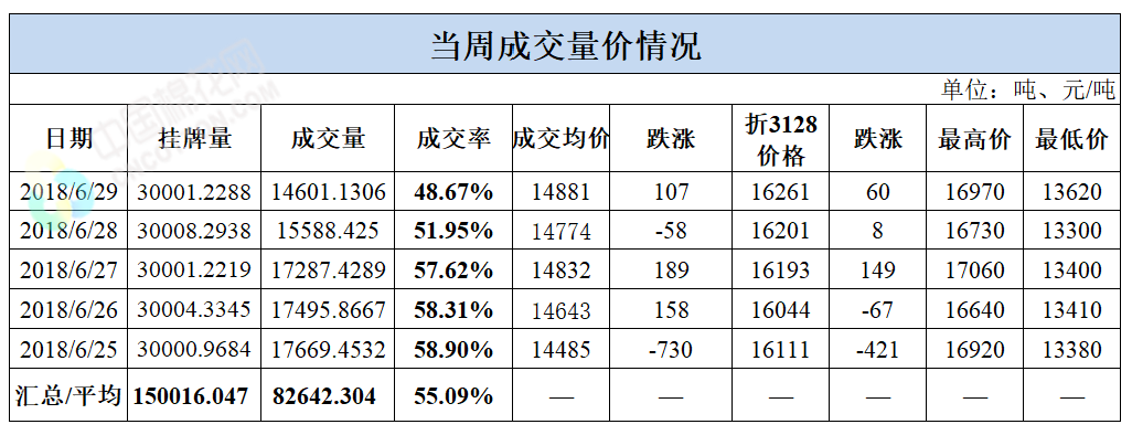 累計情況:截至6月29日,累計計劃出庫231萬噸,累計出庫成交139.9萬噸,成交率為61%;成交最高價17700元/噸,最低價12700元/噸。