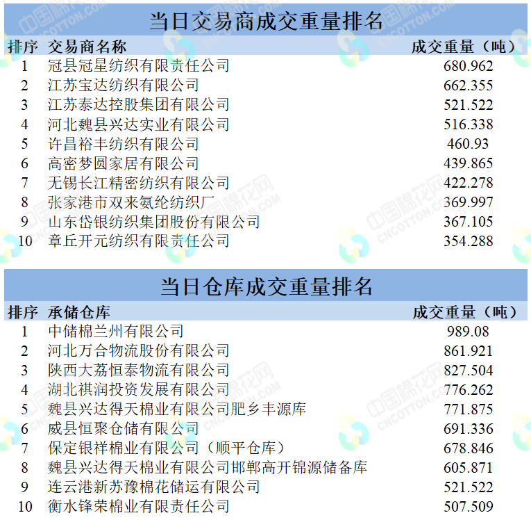 地產(chǎn)棉成交5361.738噸,成交率27%,成交均價14216元/噸,平均加價213元/噸,最高成交價15660元/噸,最低成交價13620元/噸;新疆棉成交9239.3926噸,成交率91%,成交均價15267元/噸,平均加價1022元/噸,最高成交價16970元/噸,最低成交價14400元/噸。