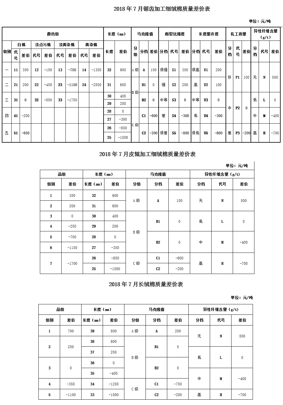 根據(jù)《中國棉花協(xié)會國產(chǎn)棉質(zhì)量差價表管理辦法》規(guī)定,現(xiàn)正式發(fā)布2018年7月《鋸齒加工細(xì)絨棉質(zhì)量差價表》、《皮輥加工細(xì)絨棉質(zhì)量差價表》和《長絨棉質(zhì)量差價表》(單位:元/噸)。