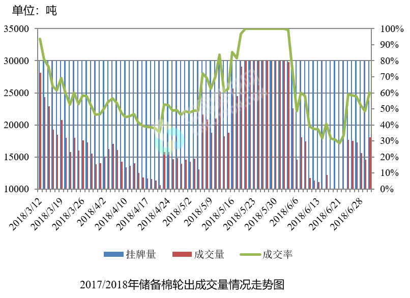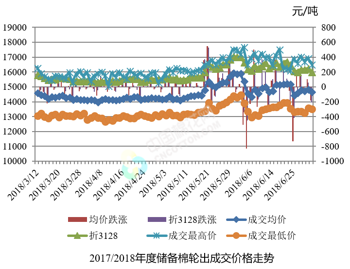 7月2日儲備棉輪出銷售資源30014.4846噸,實際成交18056.3116噸,成交率60.16%。平均成交價格14695元/噸(較前一日下跌186元/噸);折3128價格16053元/噸(較前一日下跌208元/噸)。