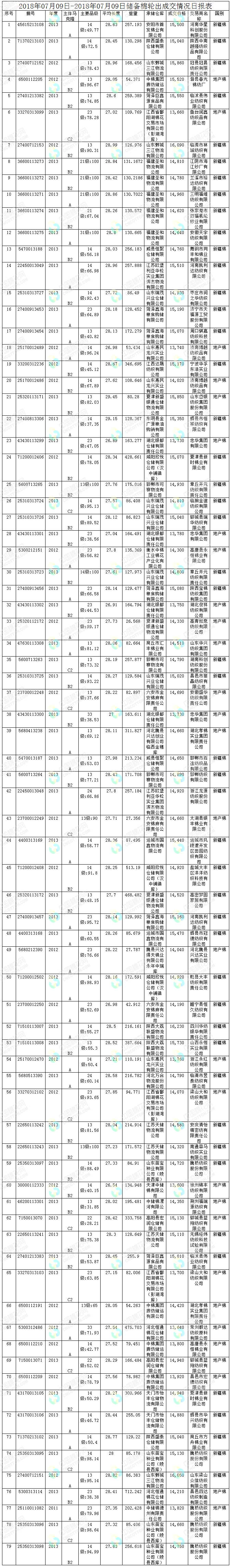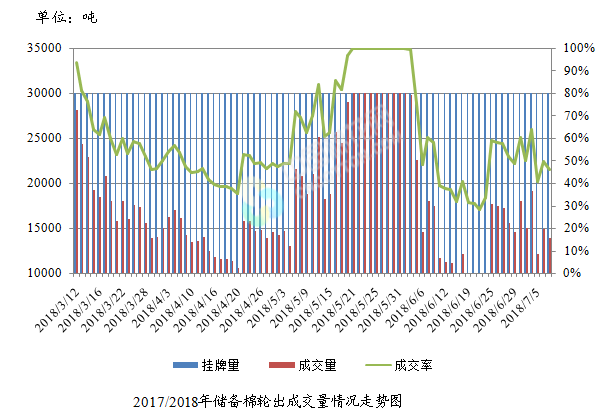 7月9日儲備棉輪出銷售資源30004.835噸,實(shí)際成交13889.499噸,成交率46.29%。平均成交價(jià)格14772元/噸(較前一日上漲91元/噸);折3128價(jià)格16085元/噸(較前一日下跌139元/噸)。