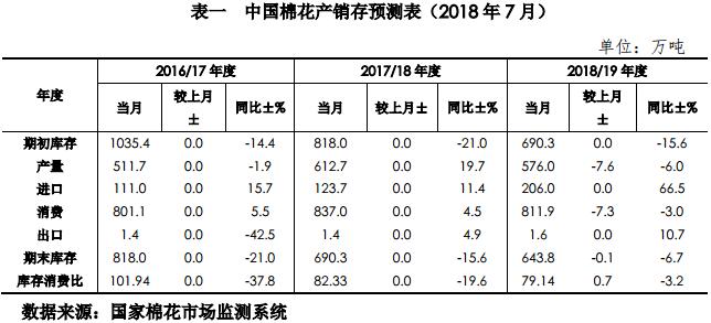 據(jù)國家棉花市場監(jiān)測系統(tǒng)最新發(fā)布的全國棉花實播面積調(diào)查報告,2018/19年度國內(nèi)棉花產(chǎn)量為576萬噸,較上期預測調(diào)減7.6萬噸;鑒于中美貿(mào)易摩擦升級對我國紡織品和服裝出口的影響,2018/19年度國內(nèi)棉花消費量下調(diào)7.3萬噸至811.9萬噸;期末庫存下調(diào)0.1萬噸至643.8萬噸。詳見下表