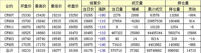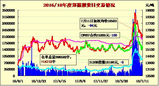 7月11日隔夜鄭棉沖高回落,今盤中低位震蕩,日線形成陰線星。日內(nèi)成交量變化不大,持倉量增加?;久媲闆r:根據(jù)美國國家農(nóng)業(yè)統(tǒng)計局(NASS)最新發(fā)布的截至7月8日的數(shù)據(jù),美國棉株整體生長狀況差到劣占比有所增加,其中以西南棉區(qū)尤甚。目前西德州區(qū)域土壤干旱持續(xù),急需長時間降雨使惡劣狀況得以改善。目前西南棉區(qū)整體現(xiàn)蕾和結(jié)鈴進(jìn)度均領(lǐng)先于去年同期及近五年平均值。周二西德州預(yù)計部分晴朗,氣溫有所降低,白天最高溫度27℃,夜間降至16-21℃。7月拉伯克地區(qū)累計降雨量僅為1.1厘米,本年度截至本月9日累計降雨量11.9厘米,遠(yuǎn)低于往年平均值28.4厘米。
