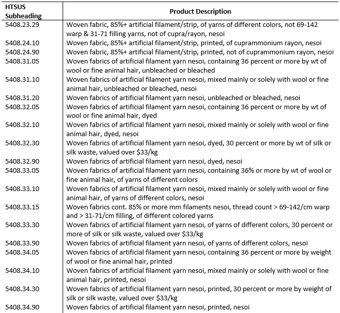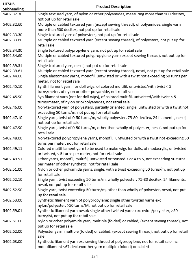 涉及加稅的《HS54章化學(xué)纖維長(zhǎng)絲、化學(xué)纖維紡織材料制扁條及類(lèi)似品》,2017年美國(guó)進(jìn)口金額5.60億美元,進(jìn)口同比6.39%,占美國(guó)進(jìn)口比重25.82%,占中國(guó)出口比重3.21%。