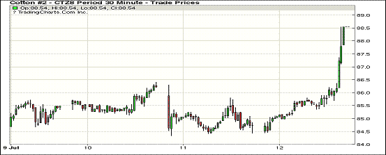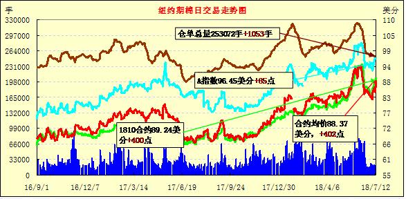 7月12日紐約期棉市場(chǎng)全面大幅收漲,多合約收于漲停。1812合約結(jié)算價(jià)88.54美分,漲400點(diǎn);1903合約結(jié)算價(jià)88.35美分,漲400點(diǎn);1905合約結(jié)算價(jià)88.23美分,漲400點(diǎn)。其他合約上漲294-346點(diǎn)不等。當(dāng)日12月合約小幅低開,開盤后維持窄幅震蕩上行態(tài)勢(shì)。在美國(guó)農(nóng)業(yè)部(USDA)月度供需平衡表發(fā)布后,美棉產(chǎn)量下調(diào)&中國(guó)消費(fèi)量上調(diào),全球期末庫(kù)存大幅調(diào)減,市場(chǎng)應(yīng)聲走高,最終收于漲停。12月合約結(jié)算價(jià)為自6月15日以來最高。根據(jù)ICE相關(guān)條款,7月13日紐期漲停板擴(kuò)大至500點(diǎn)。據(jù)美國(guó)農(nóng)業(yè)部(USDA)最新發(fā)布的7月份全球棉花供需預(yù)測(cè)報(bào)告,2018/19年度全球棉花產(chǎn)量較6月份調(diào)減6.3萬噸,消費(fèi)量上調(diào)34.8萬噸,期末庫(kù)存總量大幅調(diào)減112.8萬噸。據(jù)美國(guó)農(nóng)業(yè)部(USDA),6.29-7.5日一周美國(guó)凈簽約出口本年度陸地棉27579噸,較前一周和近四周平均簽約量明顯增加;裝運(yùn)58379噸,較前一周減少38%,較近四周平均裝運(yùn)量減少34%;凈簽約本年度皮馬棉429噸,較前一周簽約量增加82%,較近四周平均簽約量減少30%;皮馬棉裝運(yùn)3910噸,較前一周裝運(yùn)量增加43%,較近四周平均裝運(yùn)量增加66%;凈簽約2018/19年度陸地棉57023噸,皮馬棉432噸。