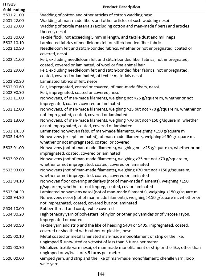 涉及加稅的《HS56章絮胎、氈呢及無紡織物、特種紗線、線、繩、索、纜及其制品》,2017年美國進口金額6.53億美元,進口同比7.35%,占美國進口比重29.37%,占中國出口比重12.84%。
