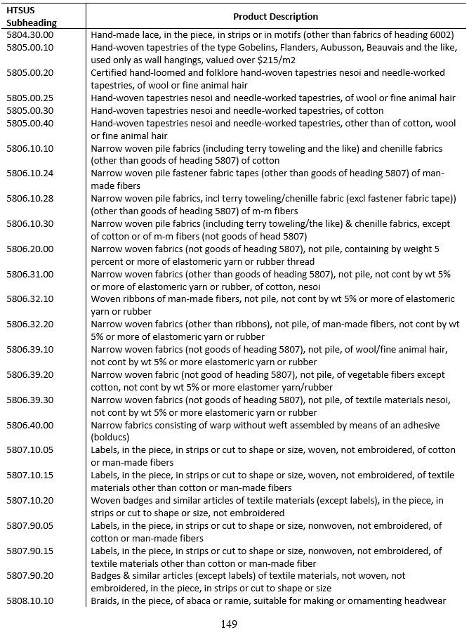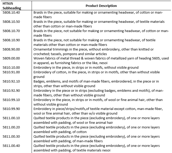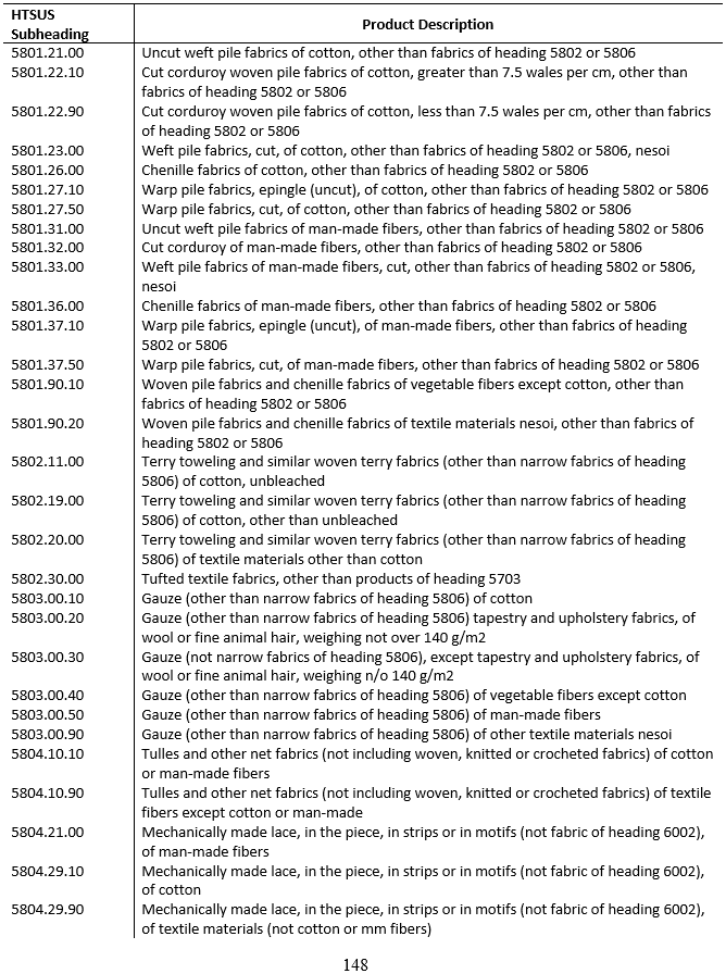 今天我們來分享一下《HS58章特種機(jī)織物、簇絨織物、花邊、裝飾毯、裝飾帶、刺繡品》具體都有哪些產(chǎn)品,見下圖